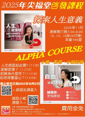 今年尖福家11月逢星期三晚上7時30分,在本堂789活動室開辦4次啟發課程,今次使用材料是「華人啟發粵語版」,內容包括4個主題,可以與參加者一齊輕輕鬆鬆地暢談: