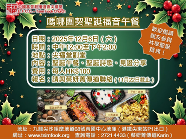 12月6日(星期六)中午12:00至下午2:00,教會副堂將舉行聖誕福音午餐。這是嗎哪團契發起、但向全教會開放的福音聚會-不論你是弟兄或姊妹,屬於哪個團契,都歡迎你邀請未信主的親友一同參加。