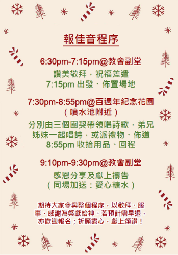 「報好信息、傳平安的人的腳蹤何等佳美!」(羅十15)弟兄姊妹,這句經文在聖誕節特別鮮明。去年我們在市政局百週年紀念花園報佳音,途人反應踴躍,許多人停下腳步聆聽詩歌、接受祝福,對報佳音是什麼一回事甚感興趣。今年,我們再次踏上這條美麗的路,願將基督的平安與愛傳遞給更多人。