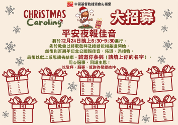 不需要特別預備,只要願意擺上自己,讓歌聲、笑容、祝福成為主所喜悅的祭。請即在教會壁報板上的招募海報簽名,願我們同心合意,讓報佳音成為城市中的亮光,讓人看見「以馬內利」的真實。期待在12月24日的夜晚,與你並肩唱出「平安夜,聖善夜」,同頌主恩,同享糖水,同得喜樂!